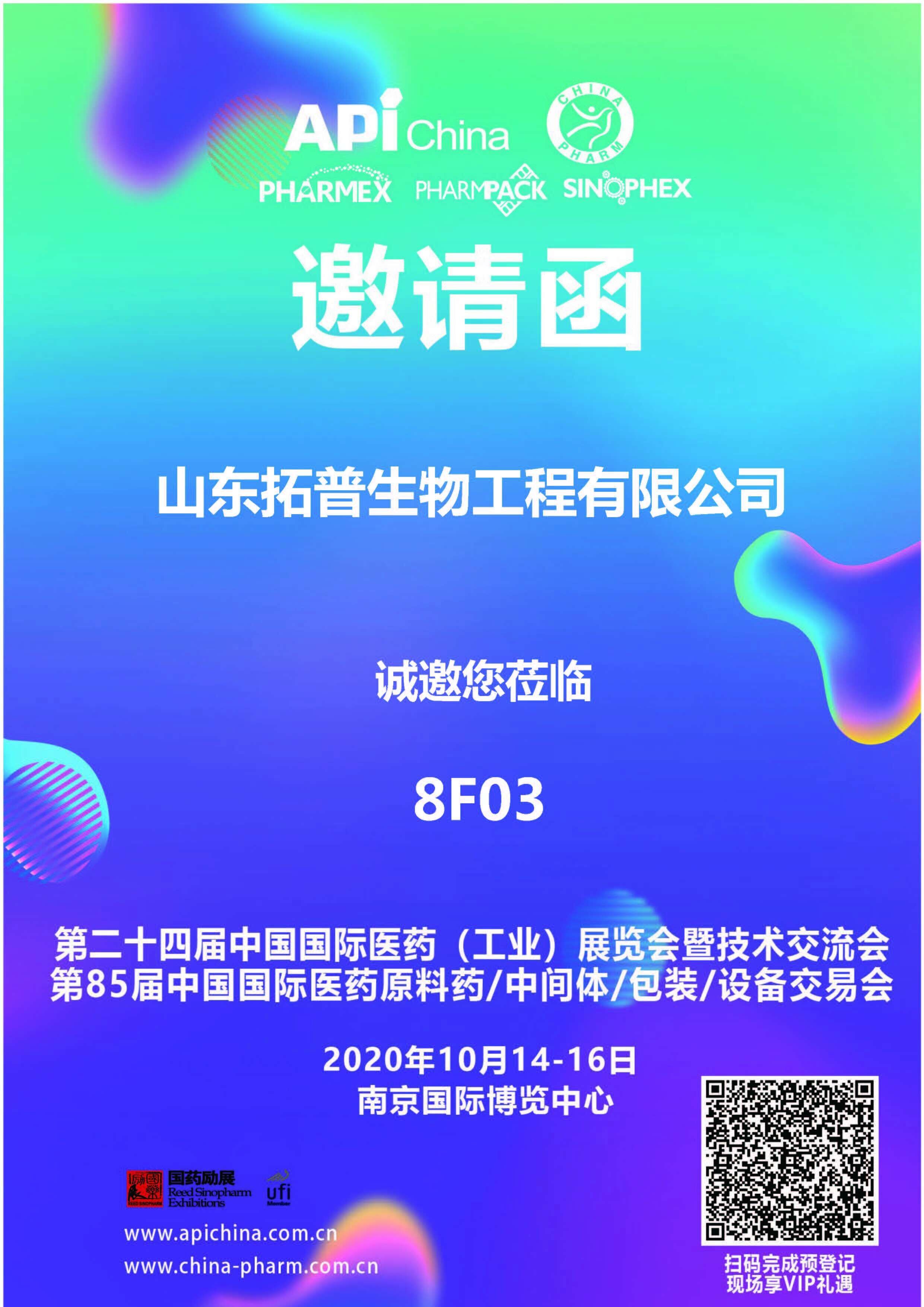 非常感謝您對拓普生物長期以來的關(guān)注和支持,第85屆中國國際醫(yī)藥原料藥/中間體/包裝/設(shè)備交易會將于2020年10月14日——16日于南京國際博覽中心進(jìn)行,我公司展位號為8F03,在此真誠的期盼您的參觀。