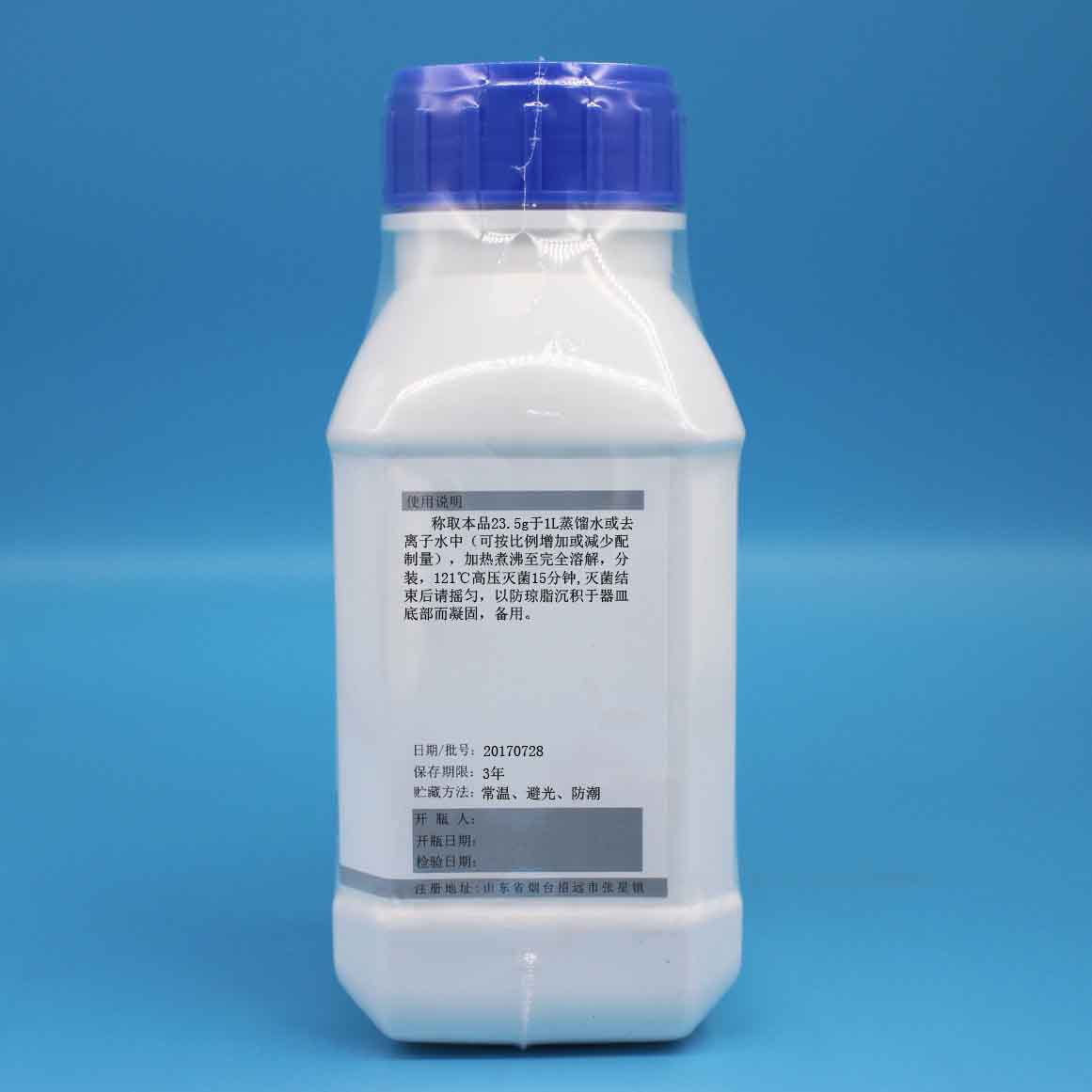 稱取本品23.5g于1L蒸餾水或去離子水中(可按比例增加或減少配制量),加熱煮沸至完全溶解,分裝,121℃高壓滅菌15分鐘,滅菌結(jié)束后請搖勻,以防瓊脂沉積于器皿底部而凝固,備用。