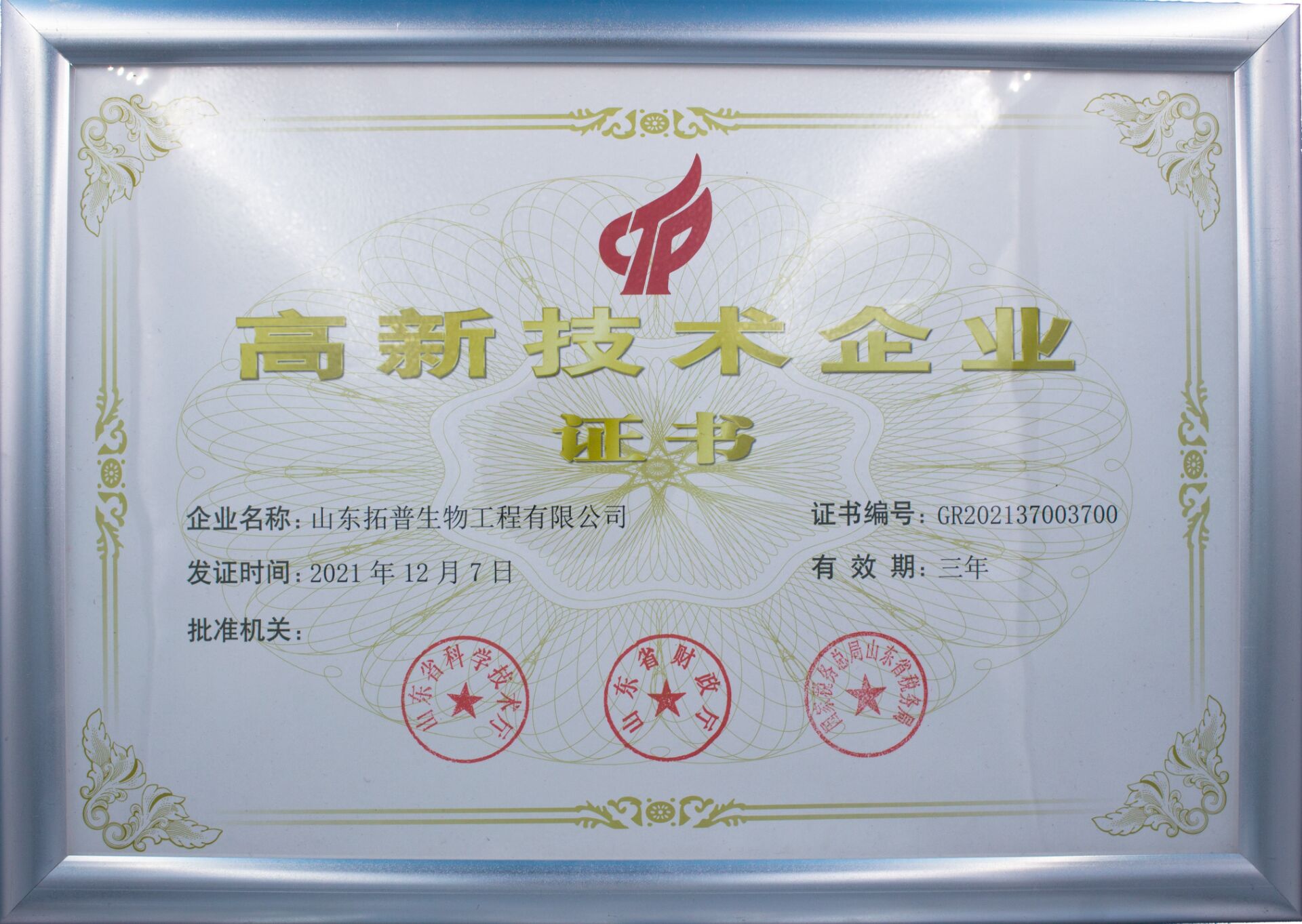 日前,山東拓普生物工程有限公司憑借專業(yè)的研發(fā)隊伍、雄厚的技術(shù)實力、不斷的創(chuàng)新能力,順利通過高新技術(shù)企業(yè)認定,由山東省科學技術(shù)廳、山東省財政廳、國家稅務(wù)總局山東省稅務(wù)局聯(lián)合頒發(fā)的“高新技術(shù)企業(yè)證書”,成為山東省高新技術(shù)企業(yè)之一。